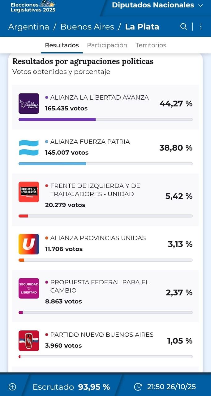La Alianza La Libertad Avanza triunfa en casi todo el país. Con el 96 porciento de las mesas escrutadas se impone con un cuarenta con ochenta y un porciento de los votos sobre el treintiuno con sesenta y uno porciento logrado por Fuerza Patria que ocupa el segundo lugar.