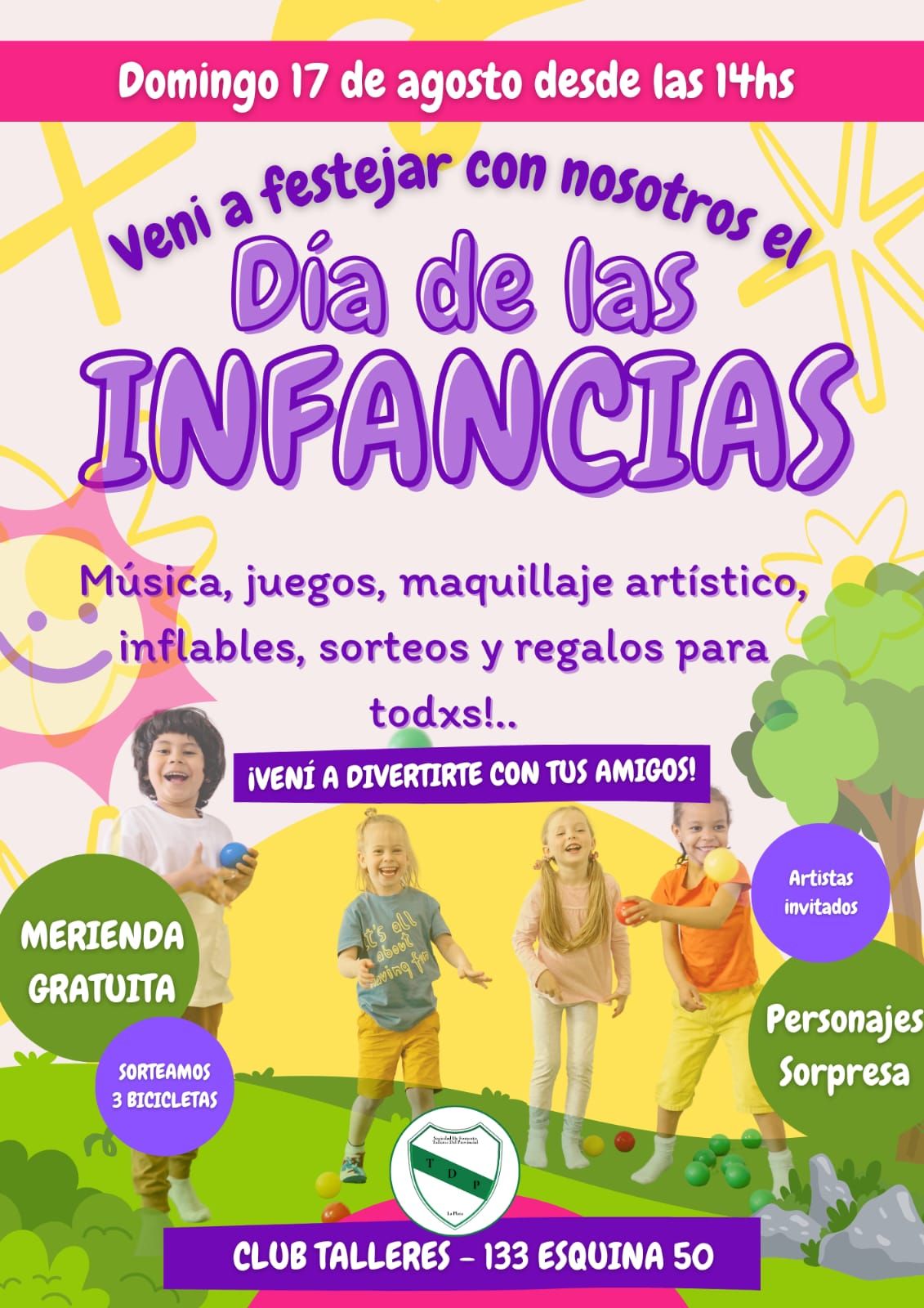 El próximo domingo 17 de agosto, a partir de las 14:00, el Club Talleres (ubicado en 133 esquina 50) se vestirá de fiesta para celebrar el Día de las Infancias. La propuesta incluirá música en vivo, juegos, maquillaje artístico, inflables y espectáculos para disfrutar de una tarde inolvidable.
